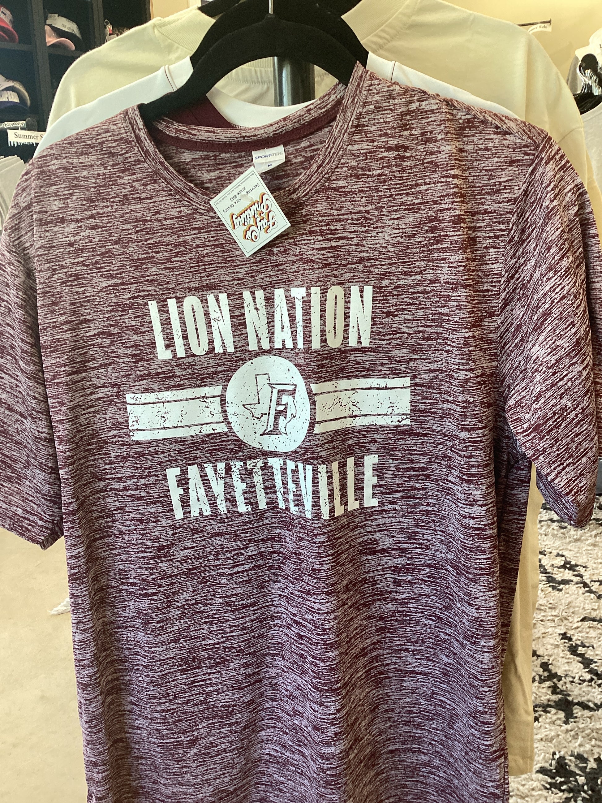 Adult Heather maroon dri fit material tee with “lions nation” on the front. SKU56