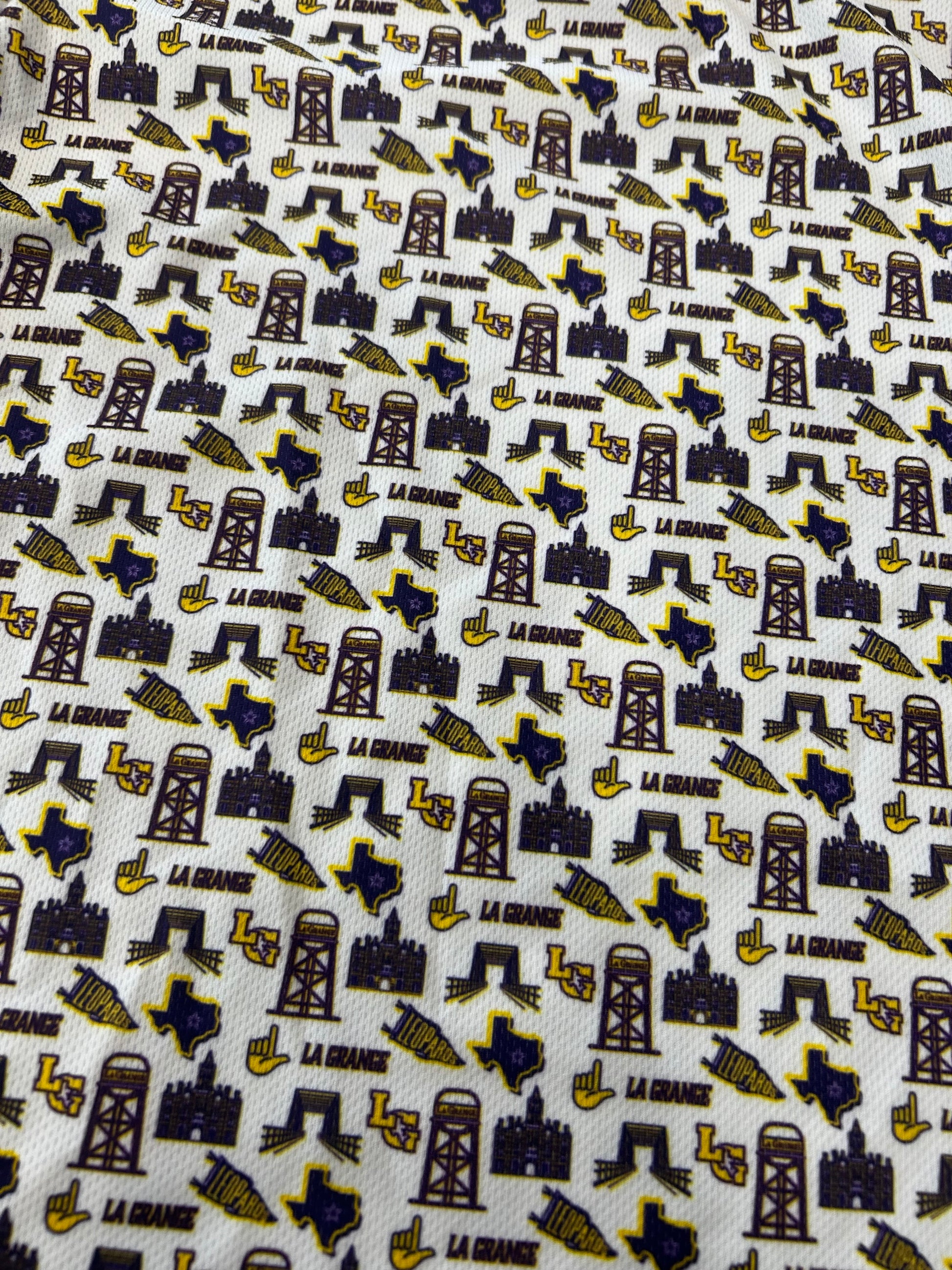 A FayCo Printing original pattern brought to life on our custom printed performance polos. This La Grange design includes the bridge, the courthouse, the water tower, Leopard's pennant, LG emblem, and of course purple & gold! SKU37