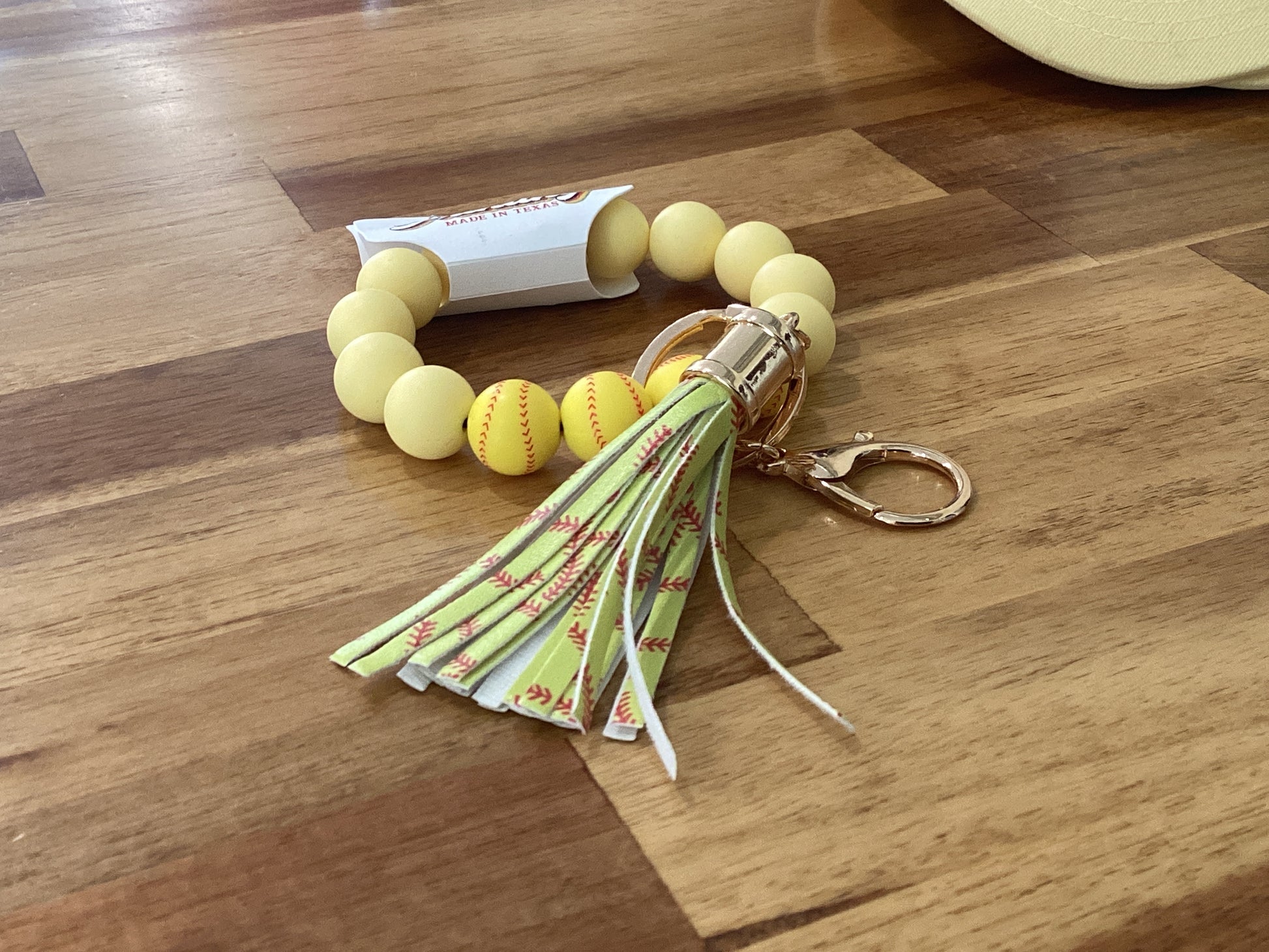 A keychain with purple, yellow, and baseball or softball beads. It also has a baseball or softball tassel with gold clip.