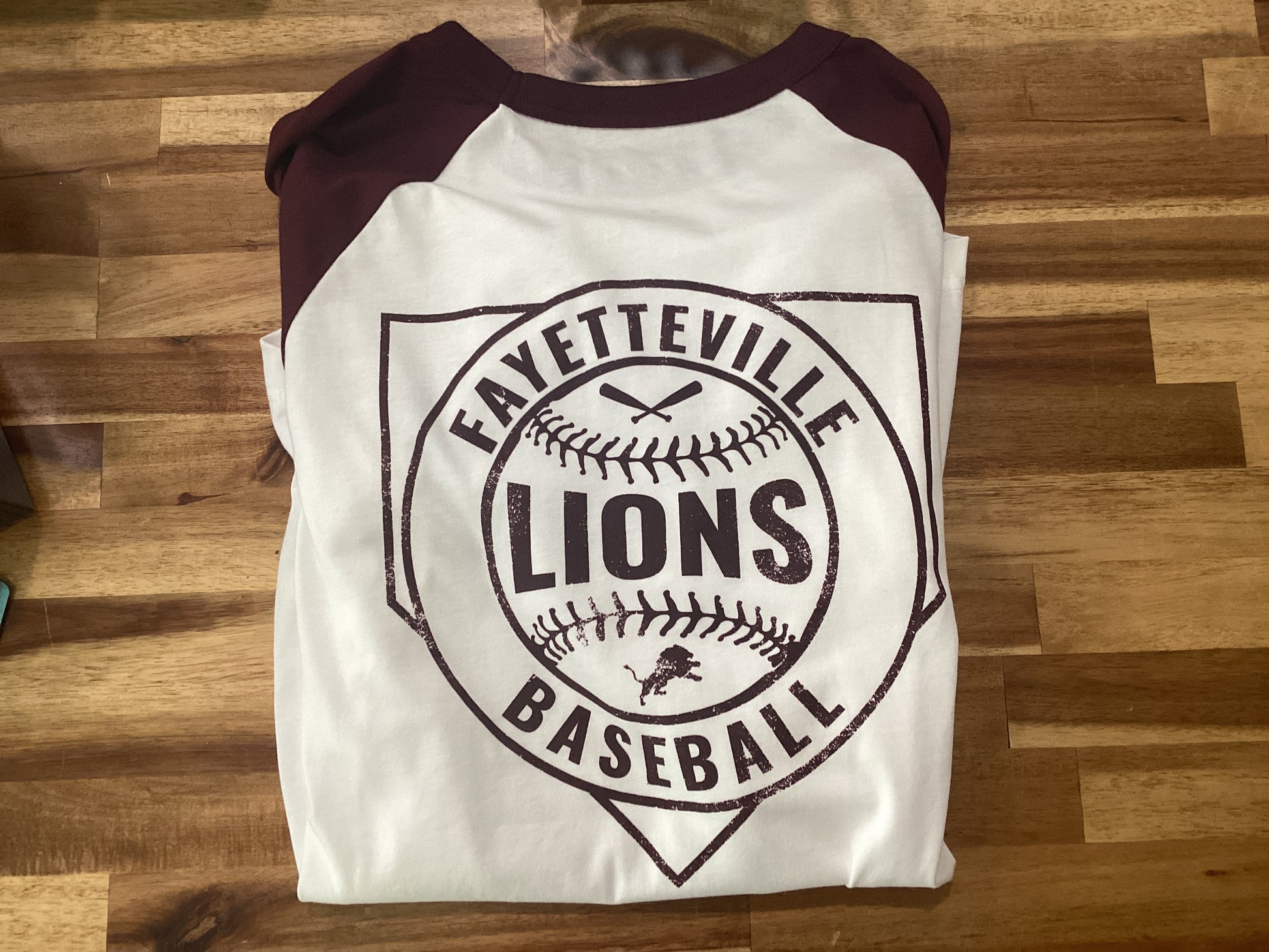 Represent your love for the Fayetteville lions with this 3/4 baseball shirt. Featuring the iconic maroon and white colors, this shirt is perfect for showing off your team pride. Cheer on the lions with this stylish shirt! SKU116