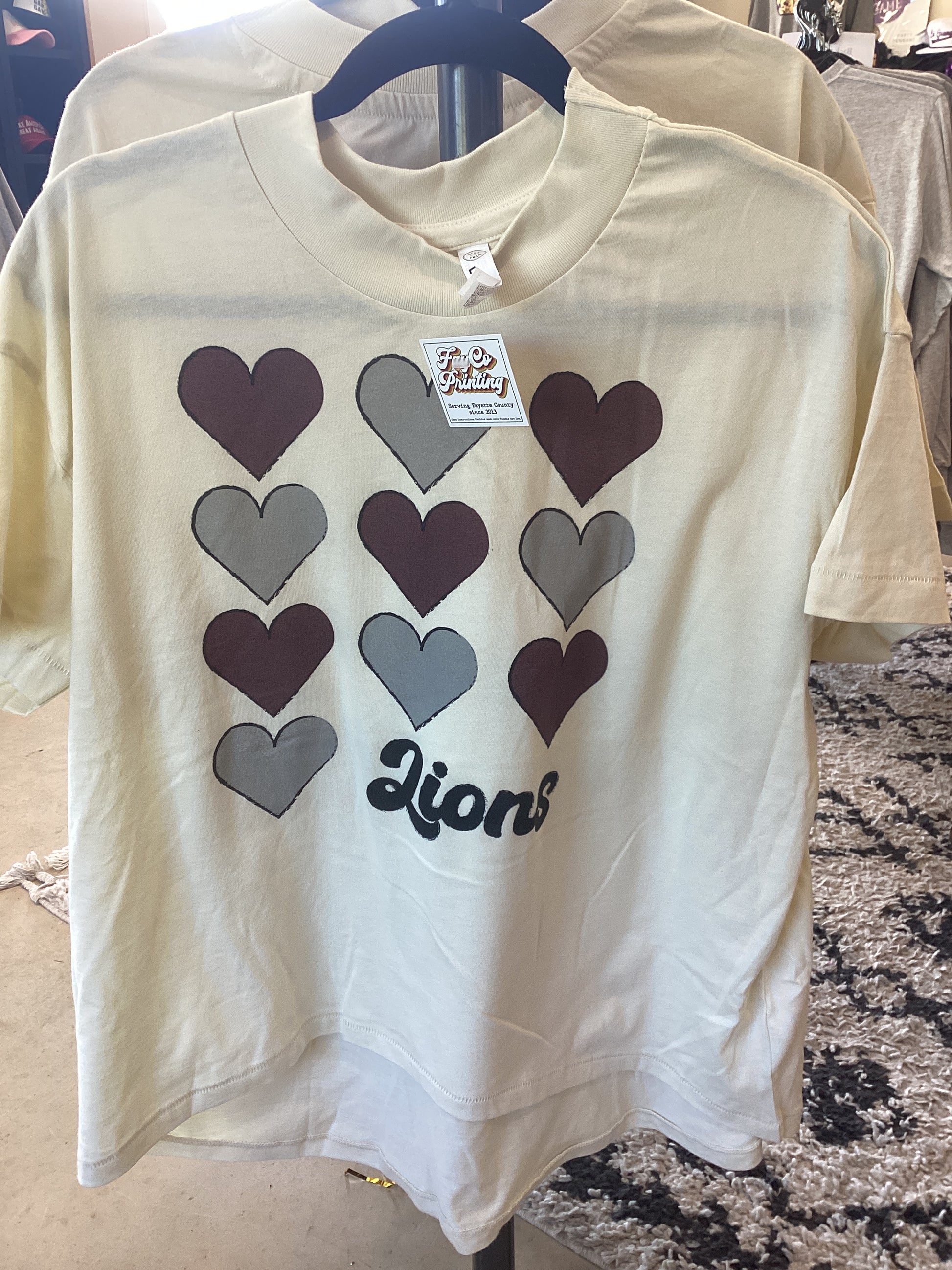 Fayetteville Lions natural ladies tee with heart design on the front. SKU60