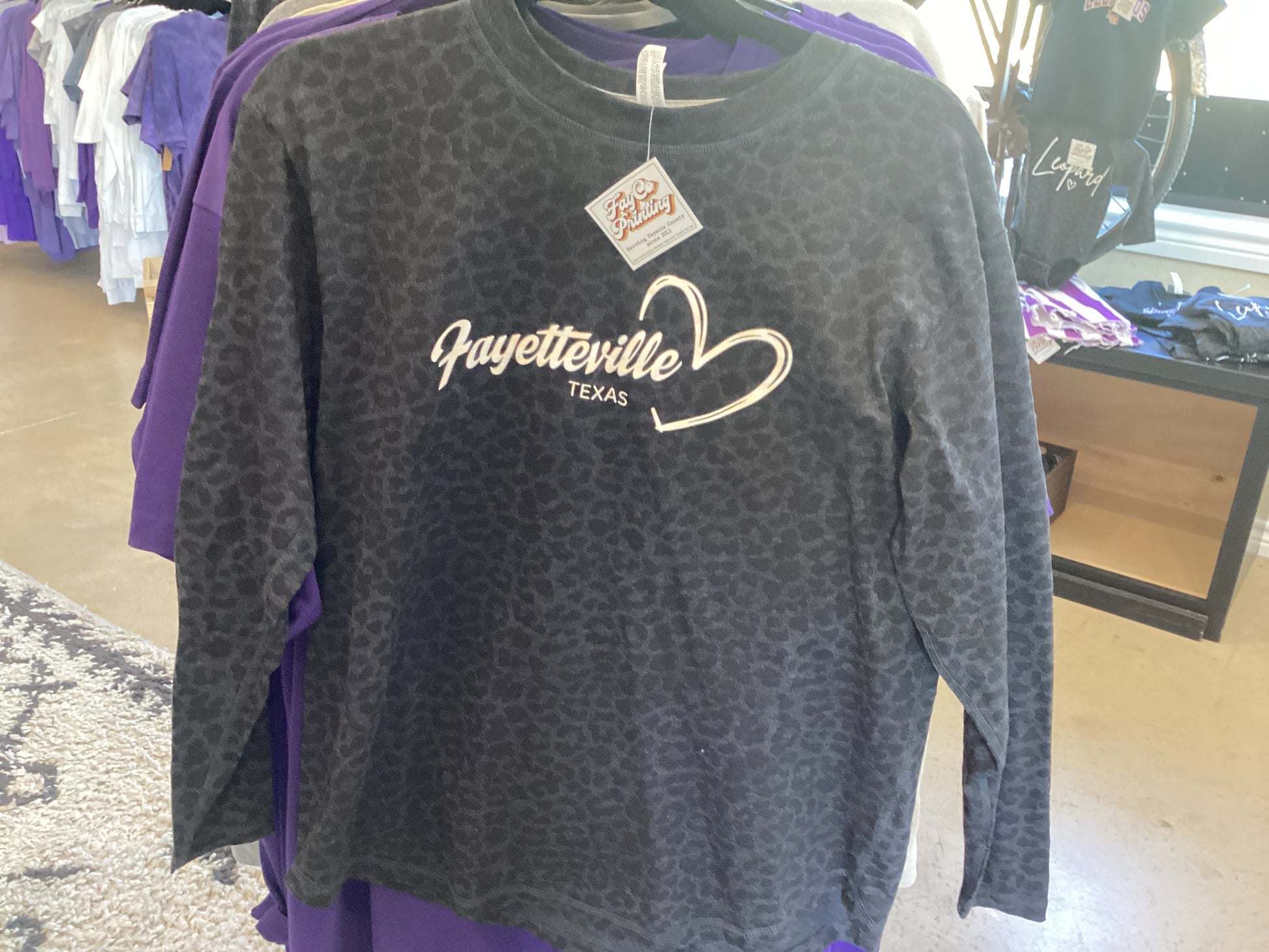 Leopard print long sleeve with screen print Fayetteville heart design. SKU71