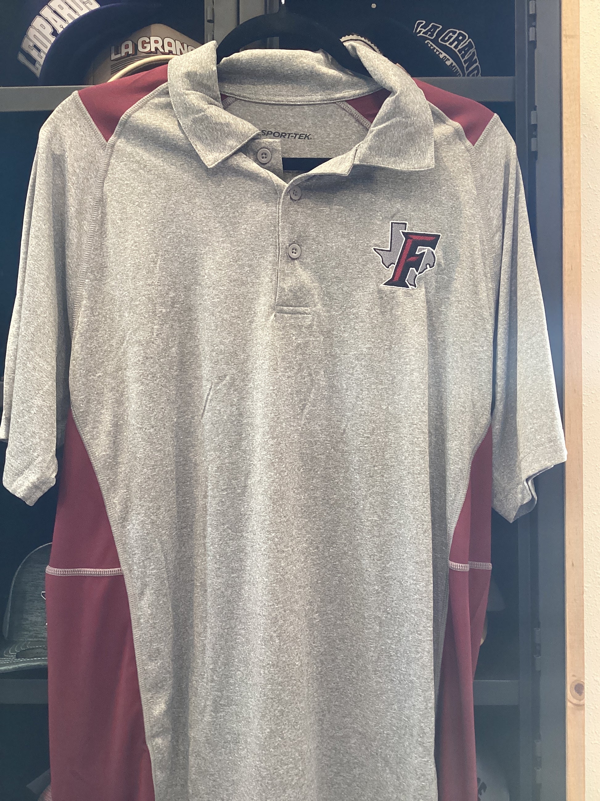 Grey and maroon polo with a Fayetteville patch on the front. SKU58