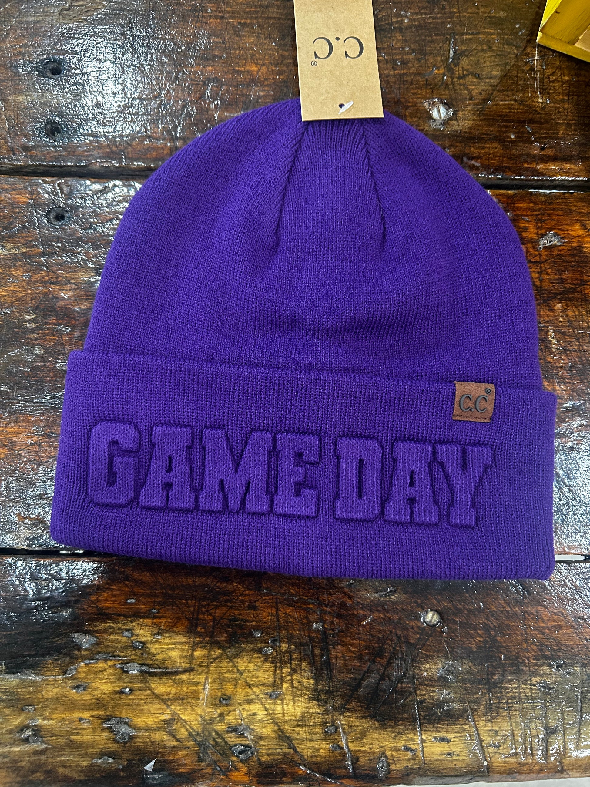 Embossed GAME DAY cuff beanies are perfect for this chilly weather! Available in black or purple. Beanie is C.C. brand and one size fits most. SKU42