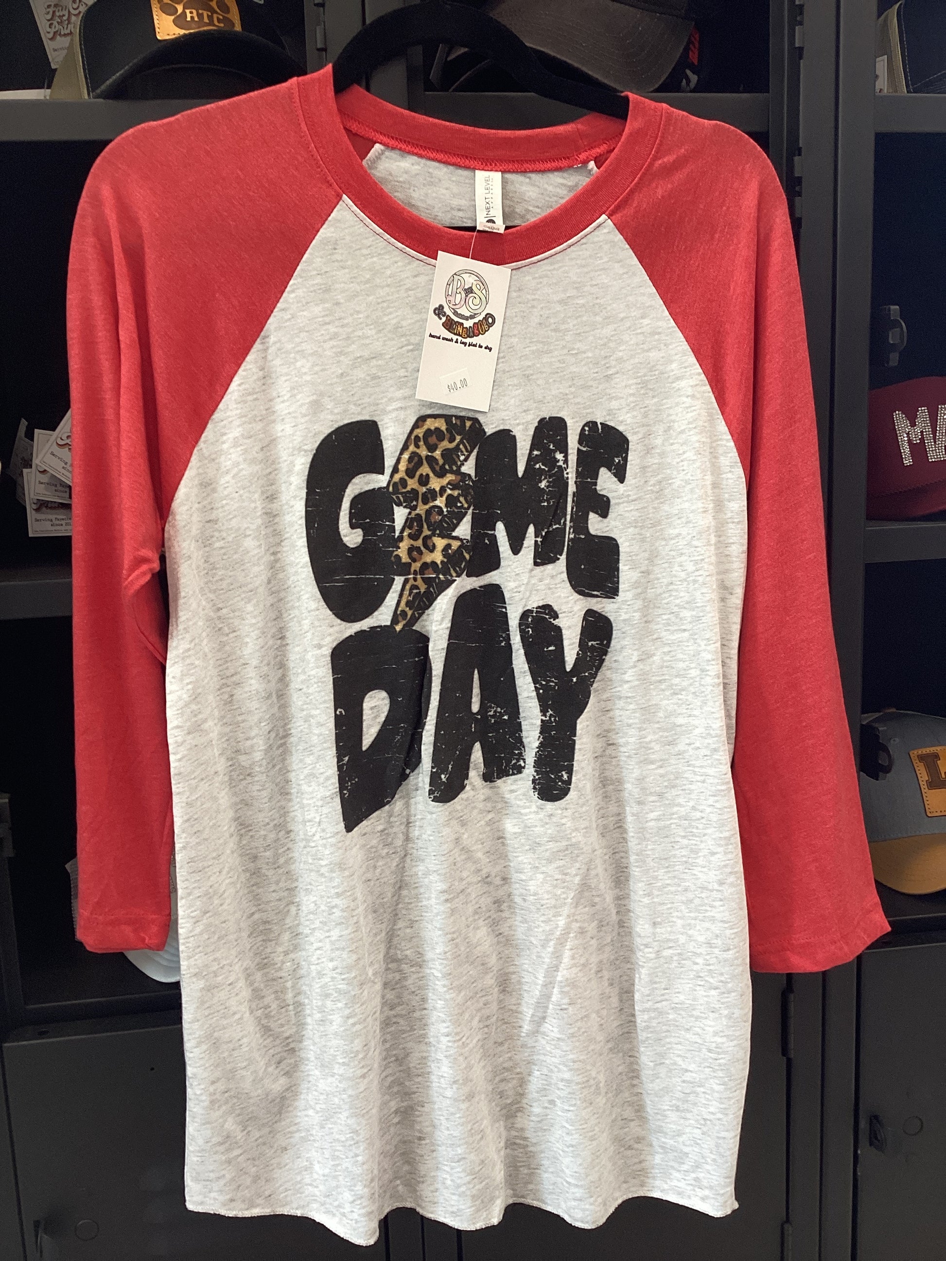 Don't miss this deal! Red and white raglan style tee with a Gameday DTG design.