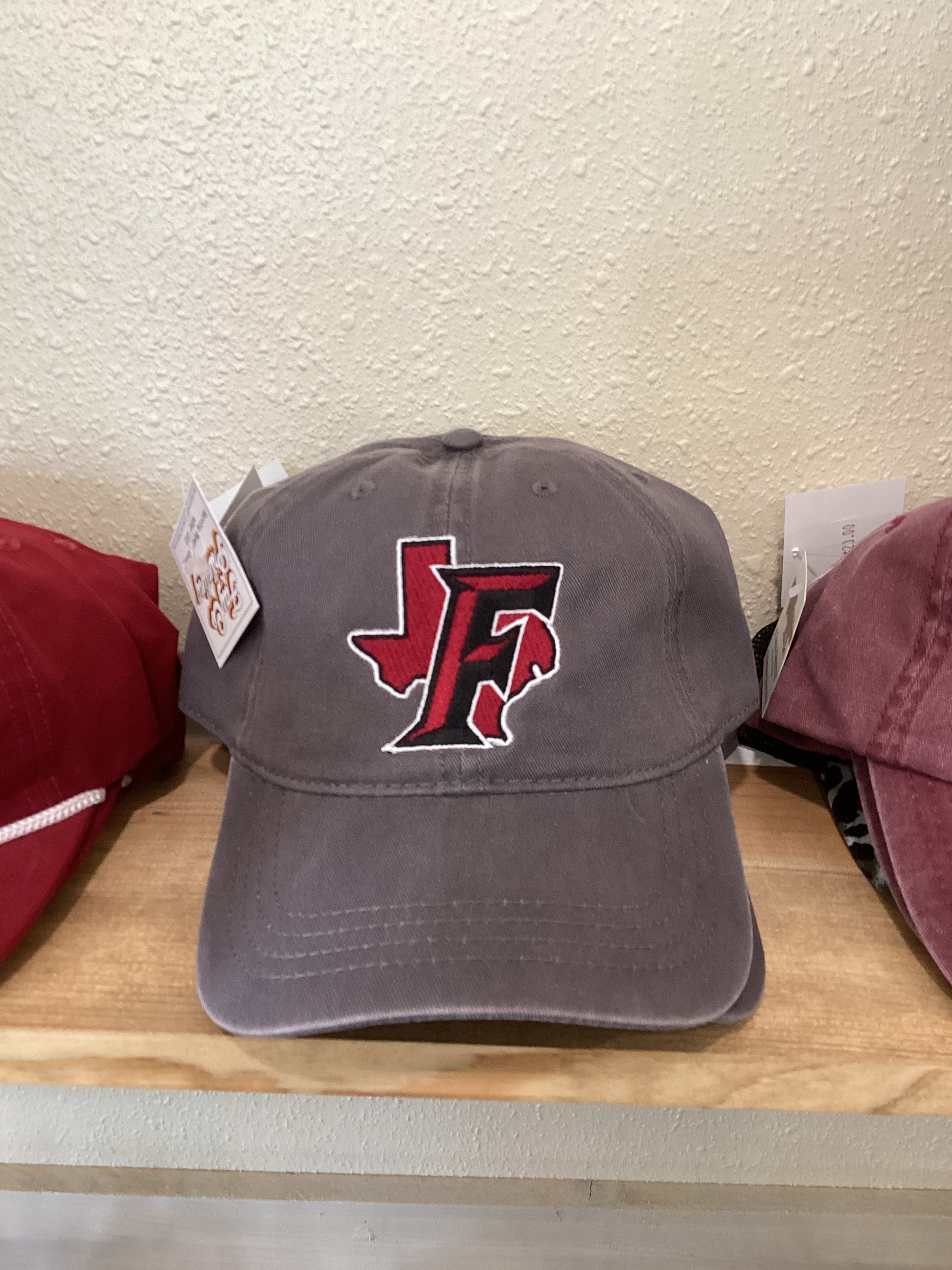 Very comfy grey softball cap with embroidered Fayetteville maroon design
