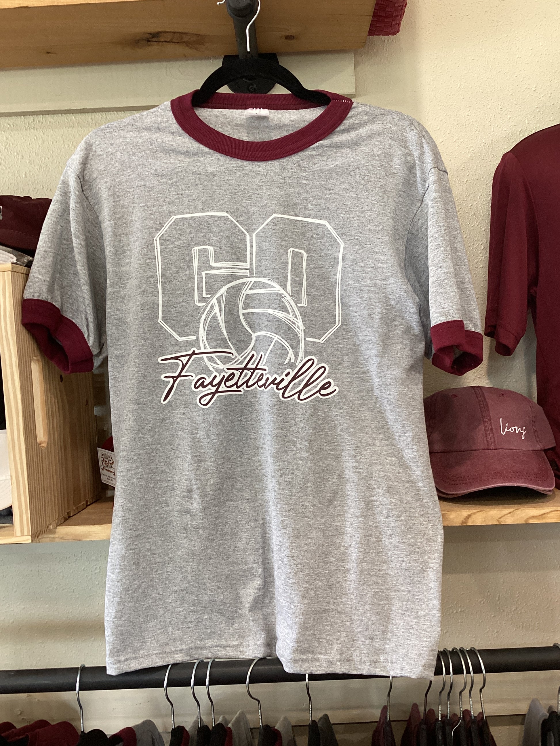 Grey and Maroon Tee with screen printed Fayettville volleyball design on front.