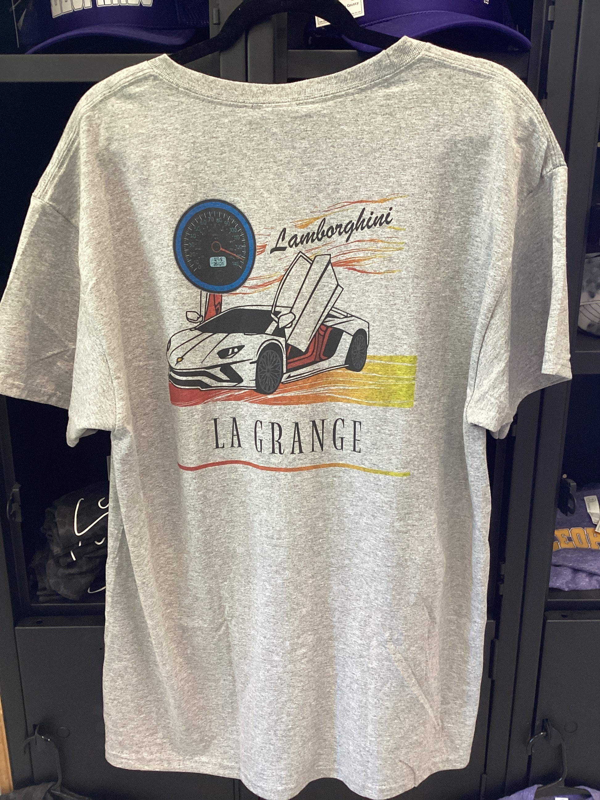 La Grange’s very own Lamborghini tees super cute with a two different colors and a few different styles. This is the grey short sleeve tee with the Lamborghini design on the front and back.