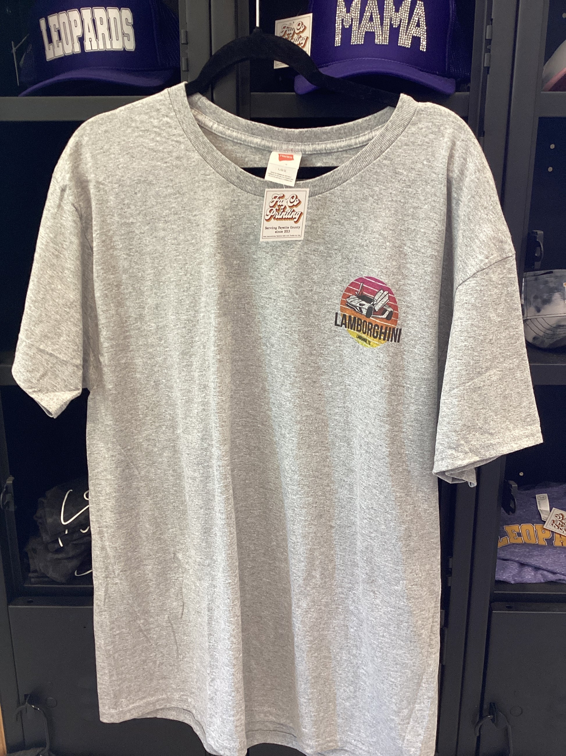 La Grange Lamborghini grey short sleeve tee with art on front and back