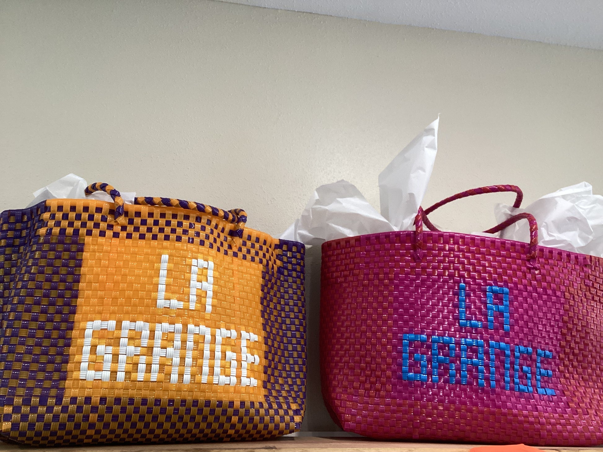 La Grange XL Woven Tote Bags. Available in traditional purple & gold as well as pink, orange, & blue color combination.