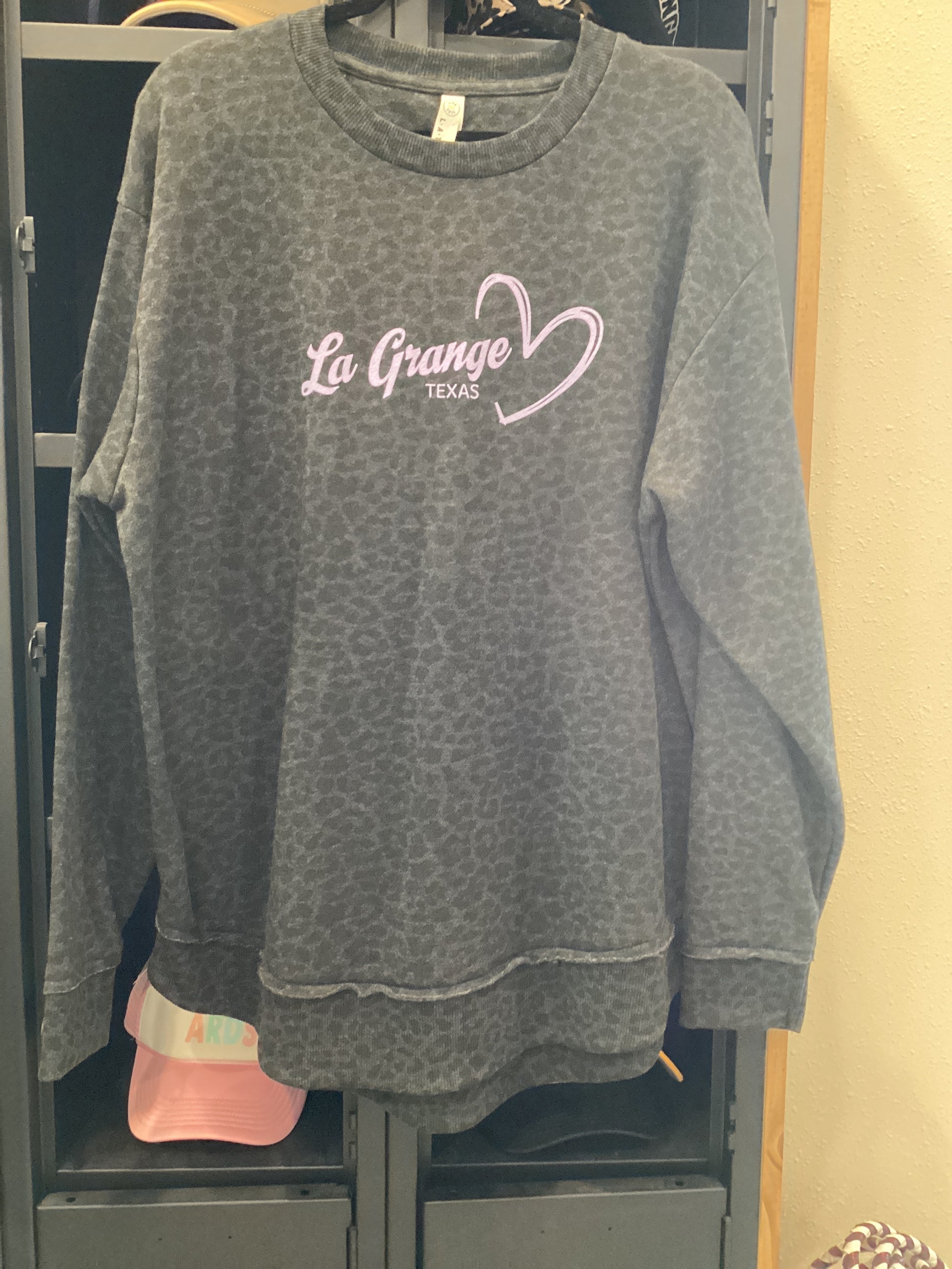 A black leopard print sweater with a light purple “La Grange Texas” and a heart. SKU28