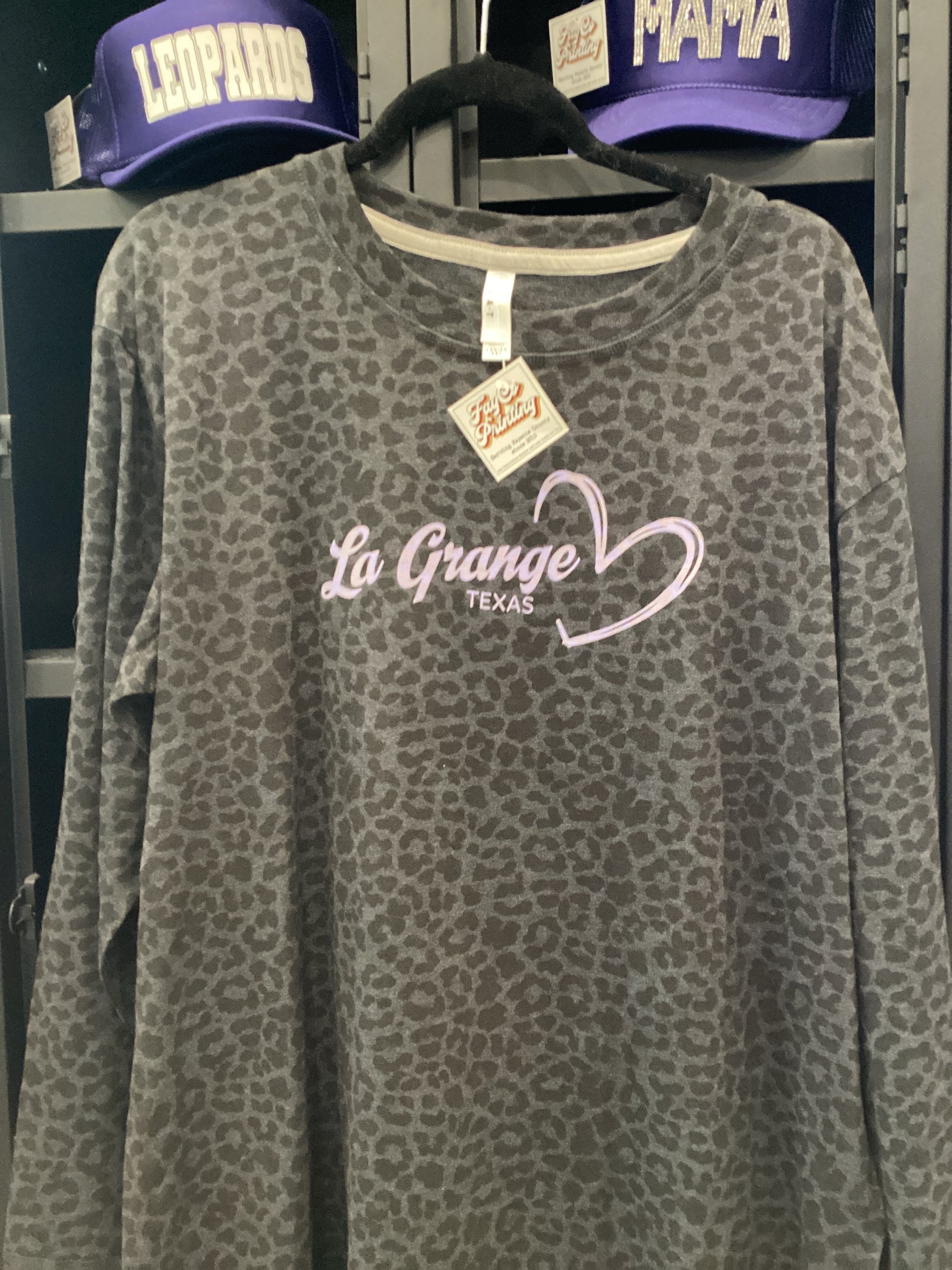 La Grange, Texas screen printed heart design on leopard print long sleeve.SKU27