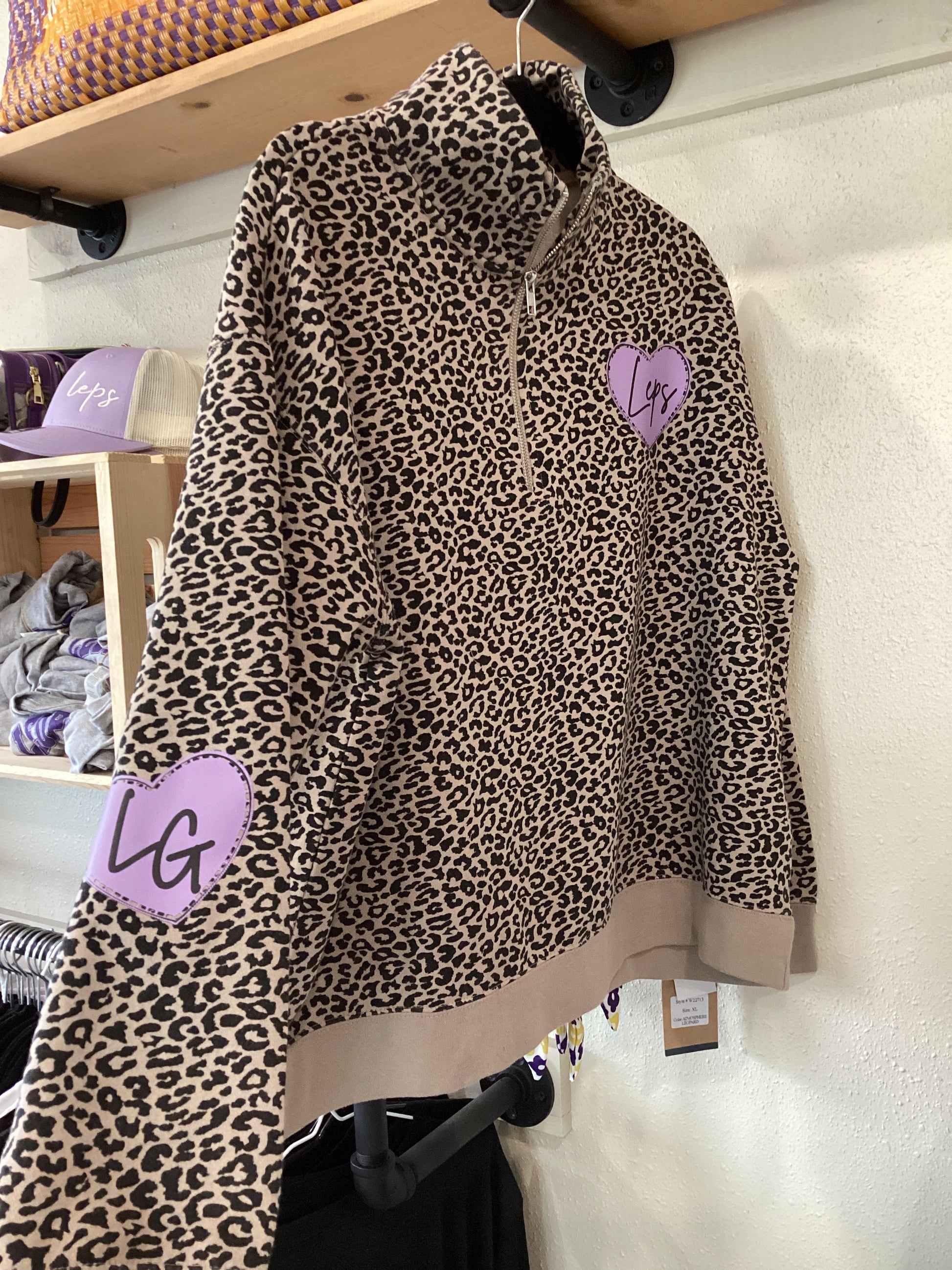 Super soft and cozy leopard print sweater with Leps on front and on the elbows it says “go leps”