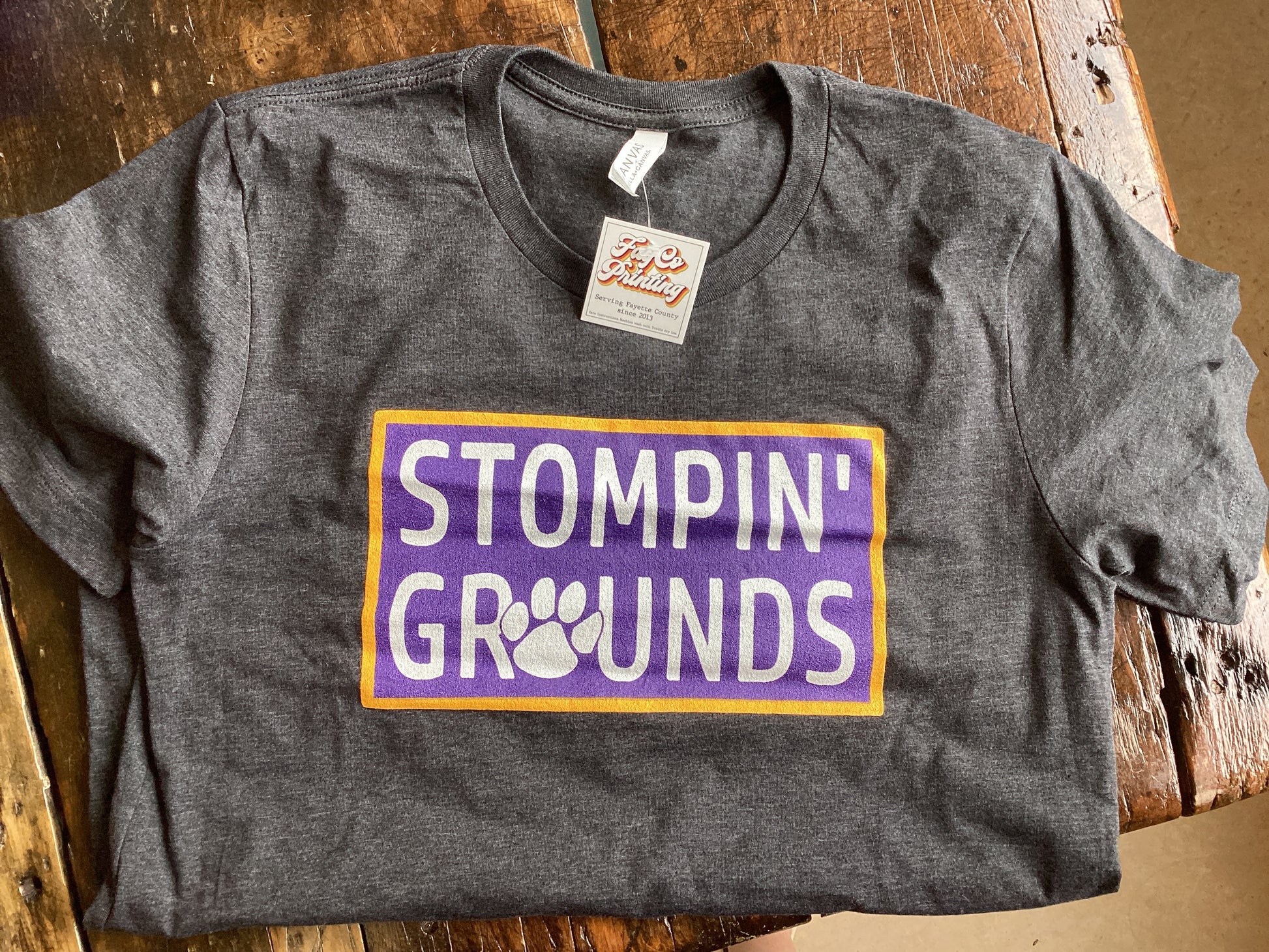 Adult black tee with leopard screen printed design on the front “stompin grounds”. SKU13