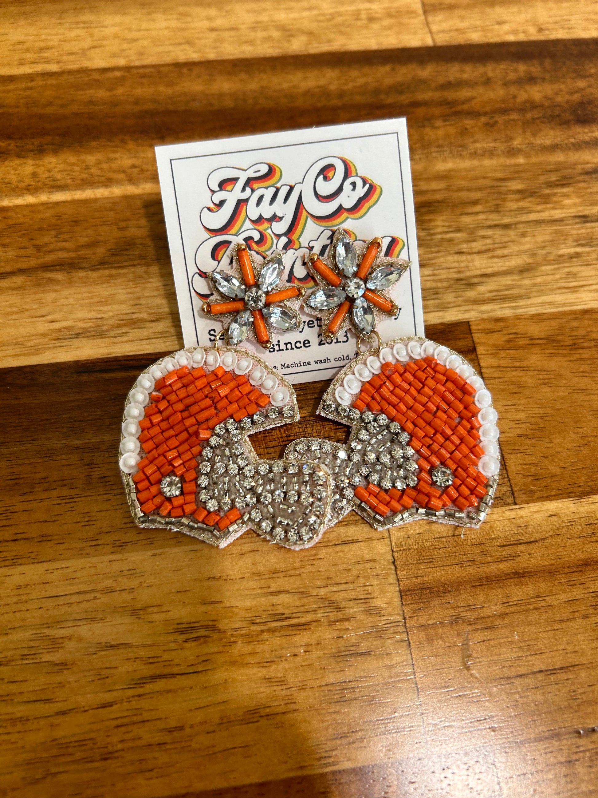 Orange & White Seed Beaded Football Helmet Earrings. Post Back Earrings.