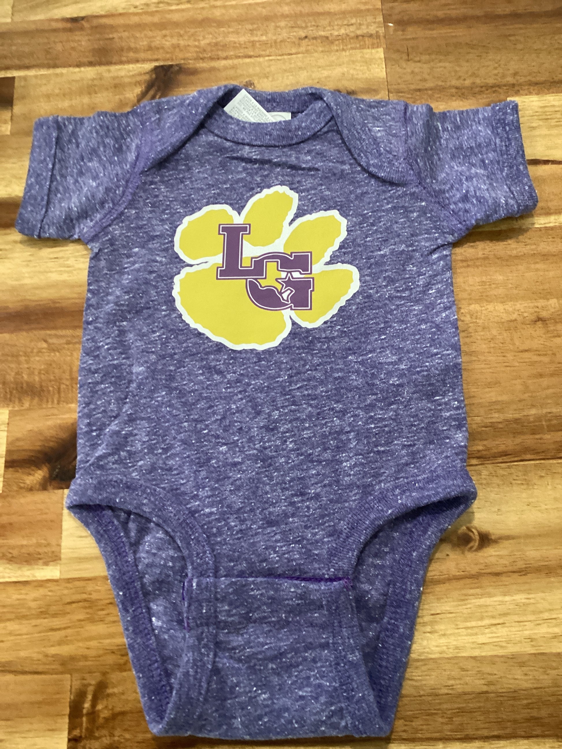 A rabbit skins purple onesie with a yellow leopard paw and LG symbol.