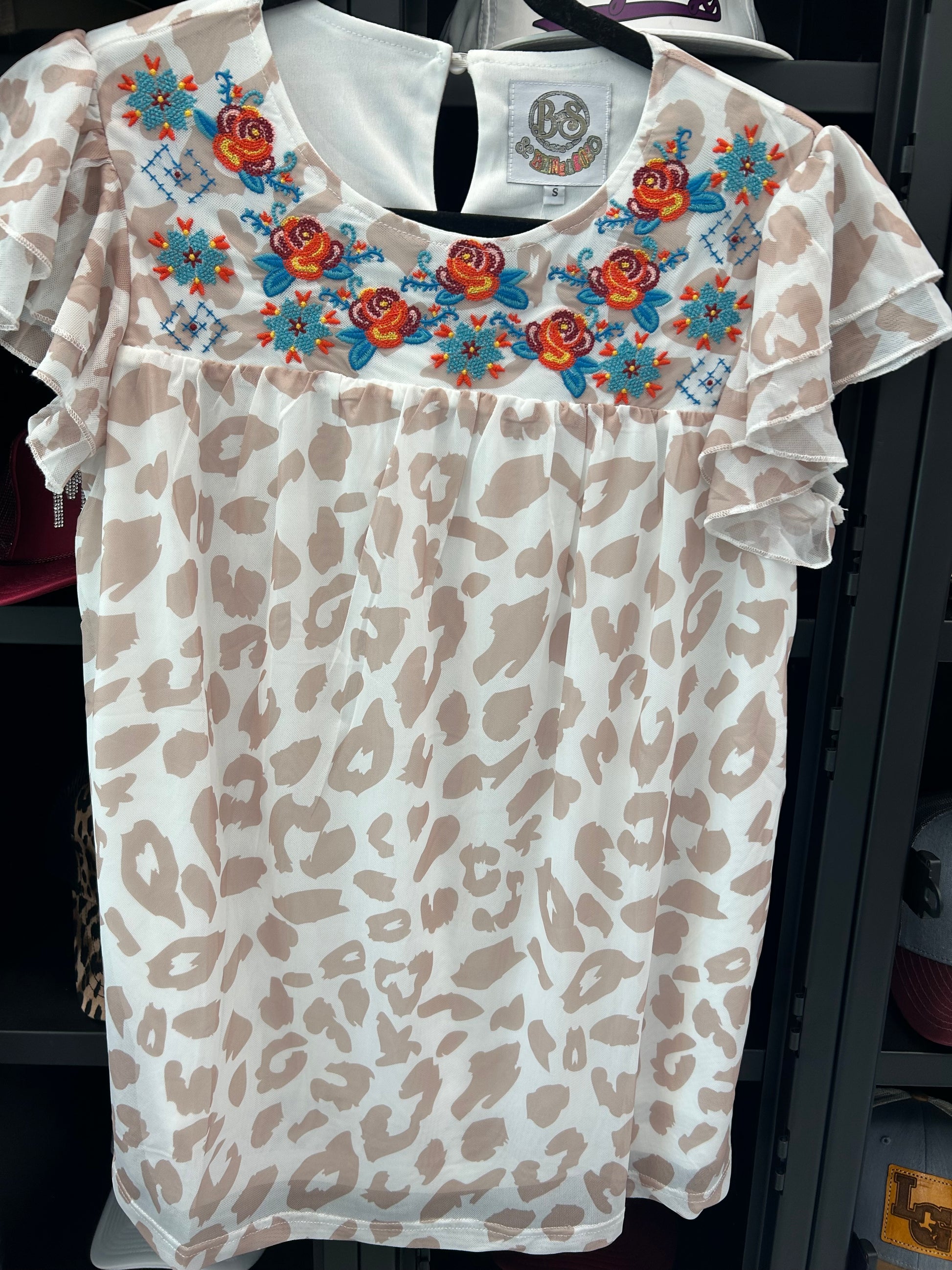 Your Favorite BlingAGogo Leopard Print Embroidered Top in Snow Leopard Print. Embroidered Detail and Flowy Fit.