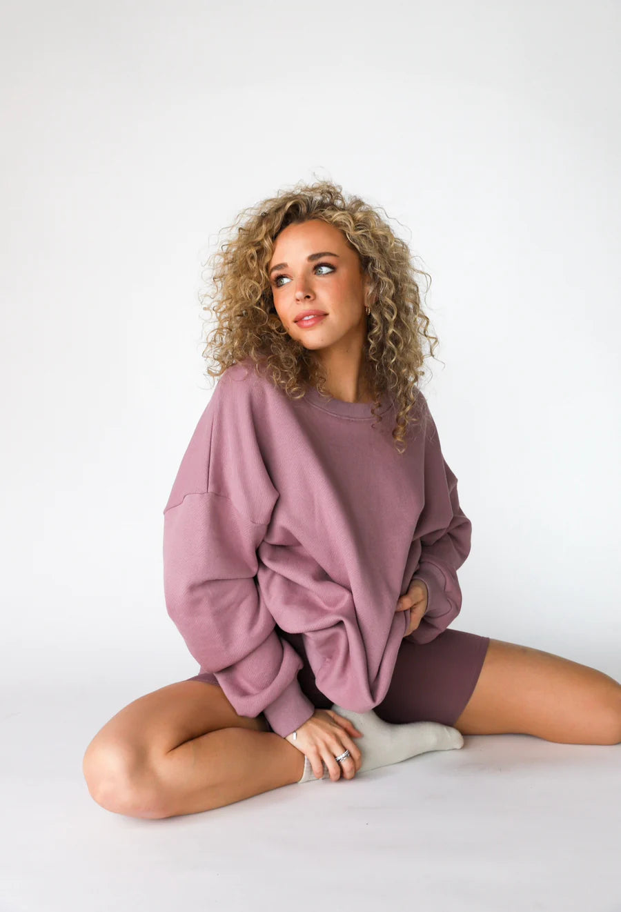 The Coffee Run Set is the perfect set for your morning errands, work from home or evening at the movies. It features an oversized crew neck sweatshirt and high waisted biker shorts. Available in Berry Attractive.