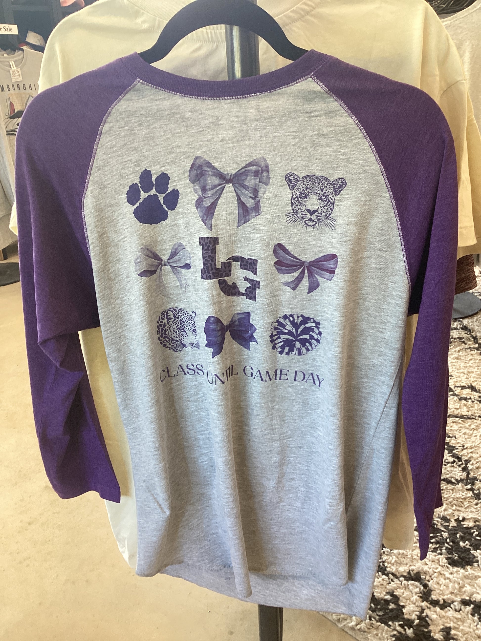 Purple and grey youth tee with “classy until game day” and bows on the front. SKU38