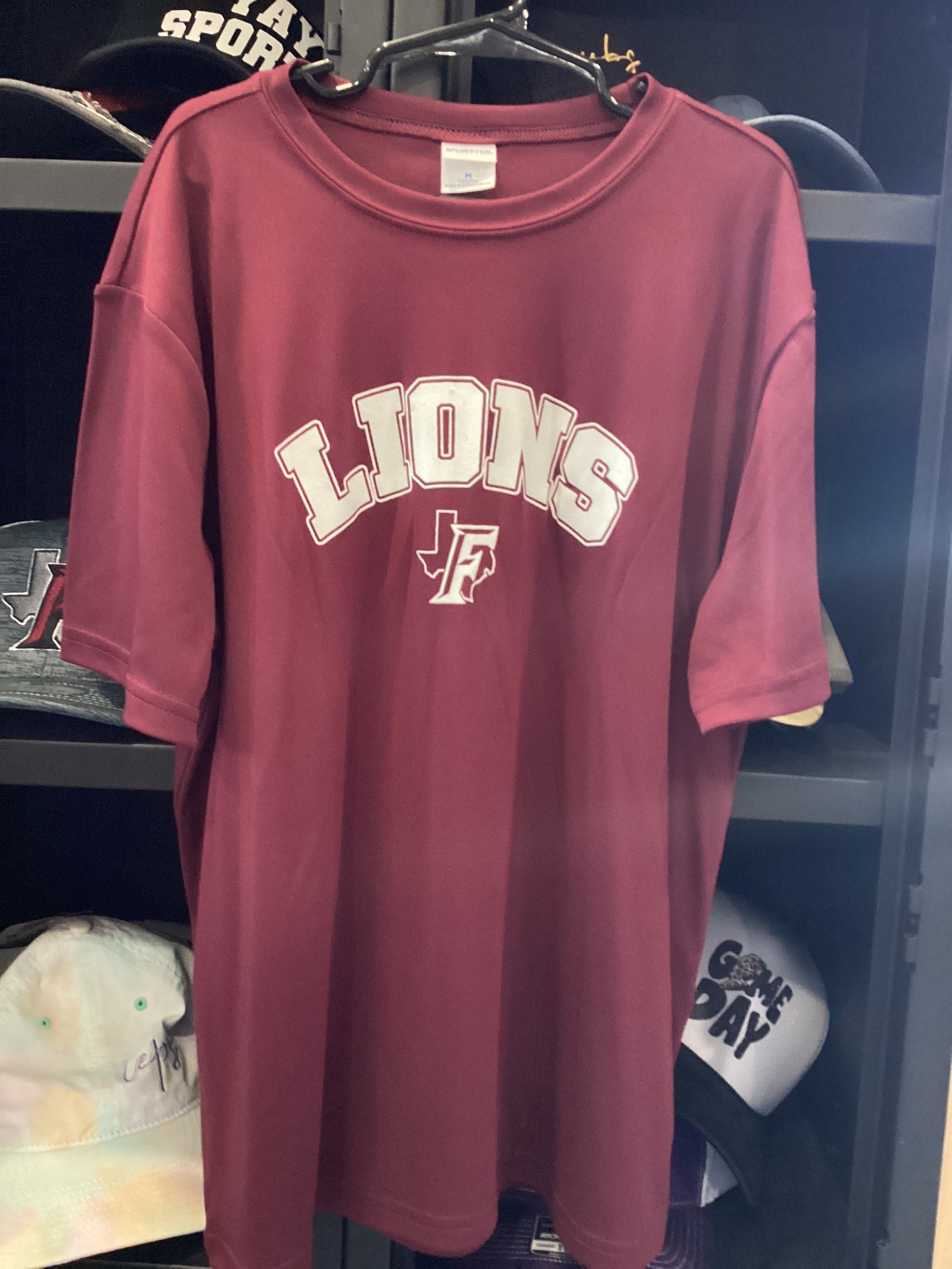 Maroon drifit tee with, ‘Fayetteville Lions Basketball’ Screen printed. SKU106