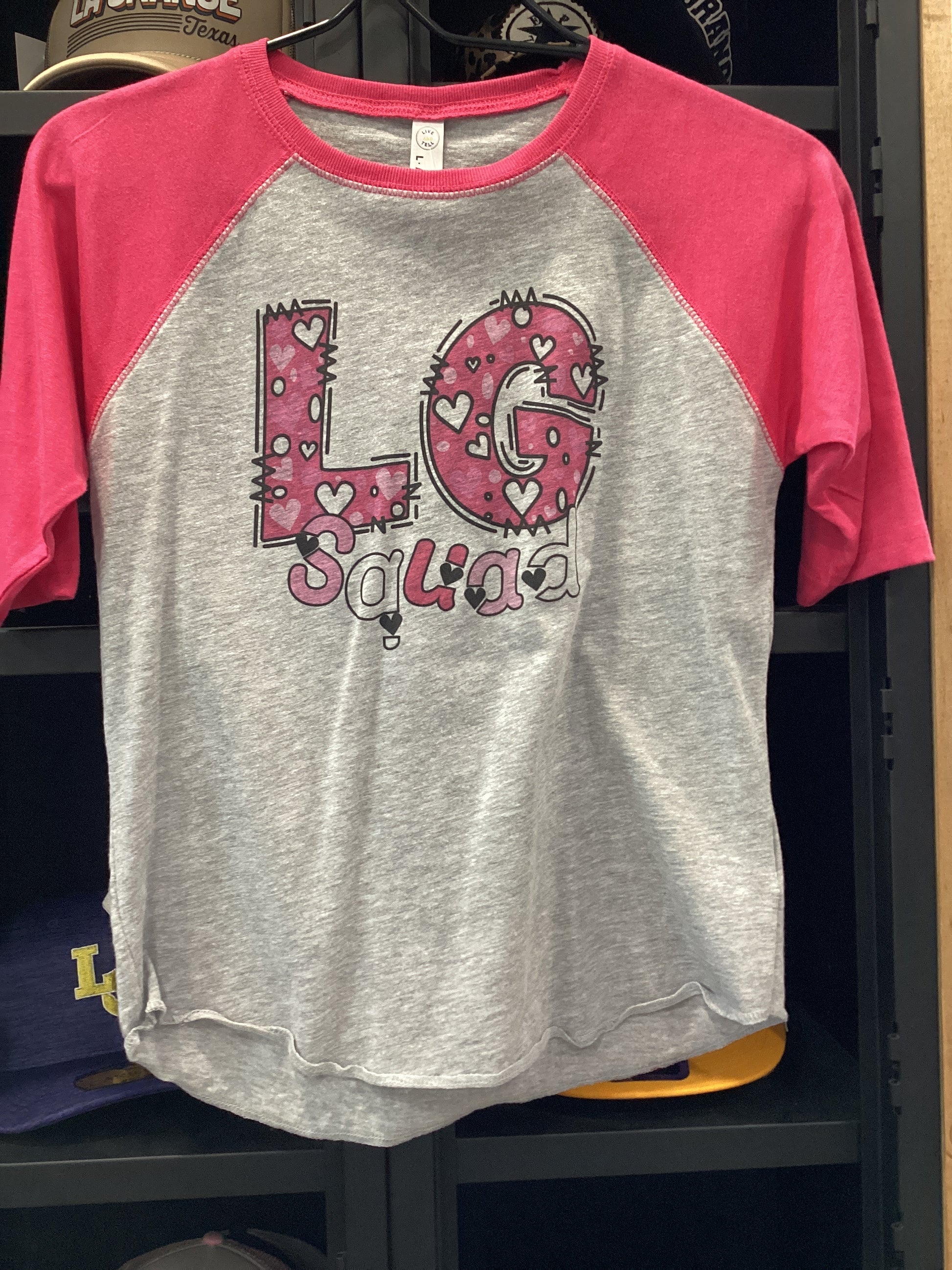 A grey and pink shirt with LG squad printed. So cute for any games and especially during February!! SKU34